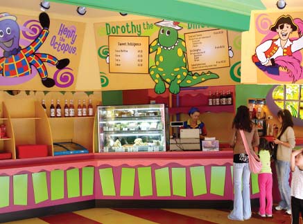 Yummy Yummy is a child friendly healthy food outlet based on The Wiggles theme. The design is arranged to balance the needs of child size customers with adult size workplace requirements and also to minimise safety concerns such as hot food or drinks crossing common paths. Wherever possible, the heights of counters, fridges and shelves are lowered to allow children to view the food selections and reach counter tops.